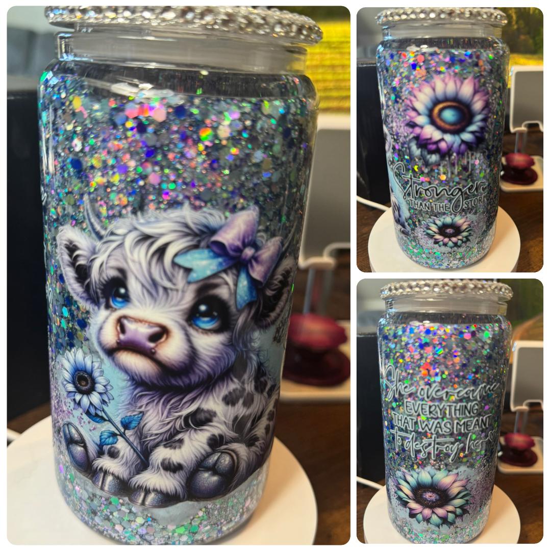 16oz Glass Snow Globe Tumbler "Highland Cow Storm"